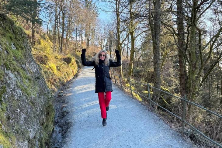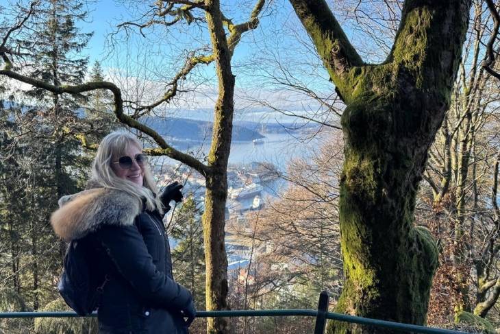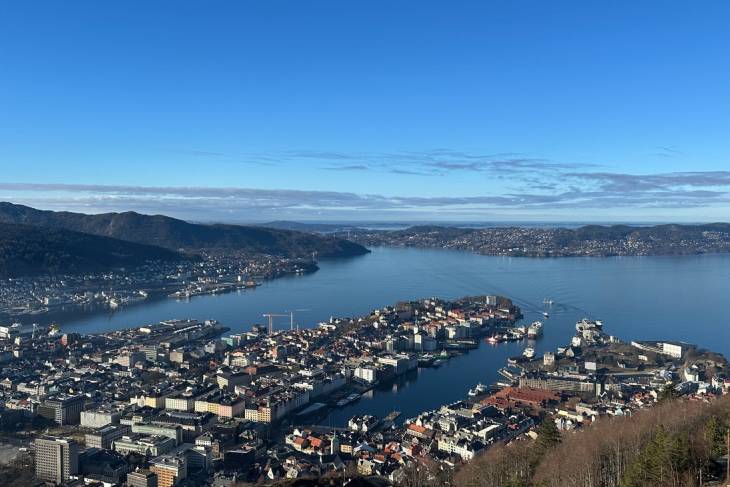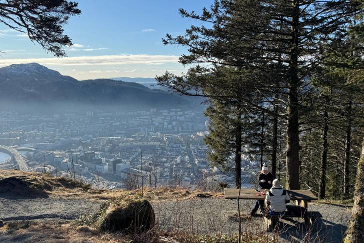 We hebben mazzel omdat het weer strakblauwe lucht is. Het uitzicht over Bergen en omgeving is smashing, de lucht is koud maar droog en na een kopje koffie voor Erik en thee voor mij besluiten we de bijna 3 kilometer naar beneden te lopen. Het is een schitterende slingerroute waar je tussen de bomen heerlijk op de stad en de haven kunt kijken.