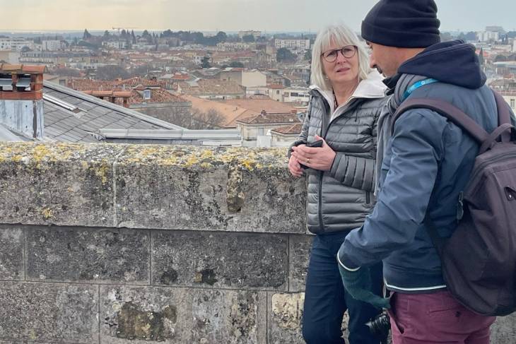 Even later opent hij zo ook een deur van de indrukwekkende Arc du Triomph (1629). Via een smal draaitrappetje komen we bovenop dit monument. Hier hebben we een uniek uitzicht op het ‘Place royale de Peyrou’ en het gigantische aquaduct uit de 18e eeuw. Van de oorspronkelijke 14 kilometer zijn nog 800 indrukwekkende meters over.
