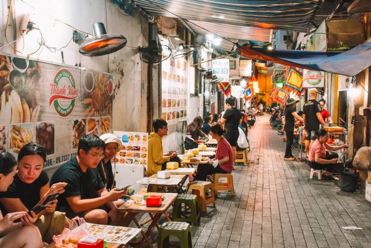 Mijn dagen in Hanoi vloeien samen in een waas van kleuren, geuren en indrukken. Elke avond keer ik, moe maar gelukkig, terug naar het hotel in het Old Quarter. Zelfs al is het donker, toch is het even druk op straat als overdag. De geur van noedelsoep walmt uit de kleine eethuizen en overal zitten mensen op lage stoeltjes te eten. Het leven van Hanoi speelt zich voor het grootste deel af op straat. Mensen ontmoeten elkaar bij eetstalletjes waar op geïmproviseerde vuurtjes wordt gekookt terwijl iemand anders de vaat doet in plastic wasbakjes.