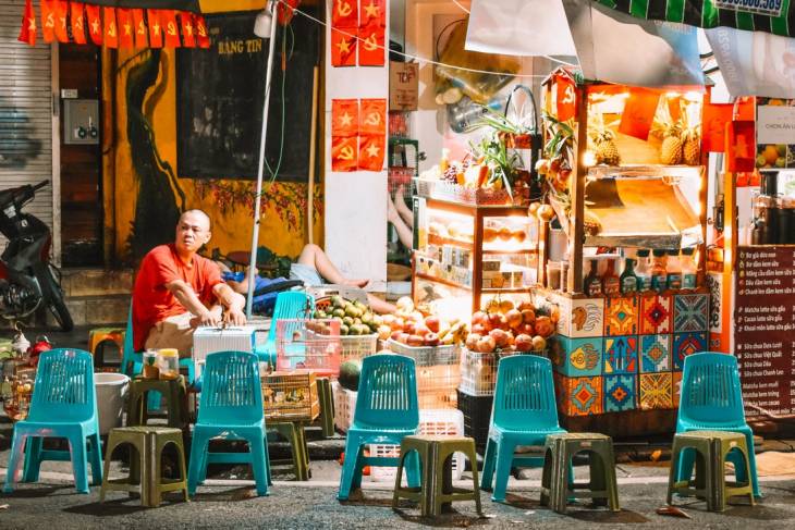 Ik kies een terrasje uit en bestel wat te drinken. Vanop mijn stoel kijk ik hoe een man zijn scooter wast en een andere Vietnamees op de drempel van zijn huis zit. Verder is er niemand te zien. Ik neem een slokje van mijn blikje en geniet van de zeldzame stilte in de stad.