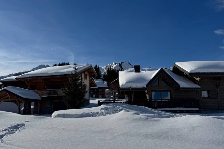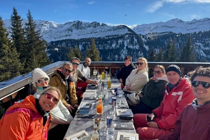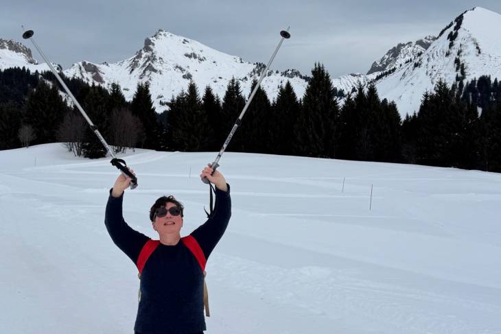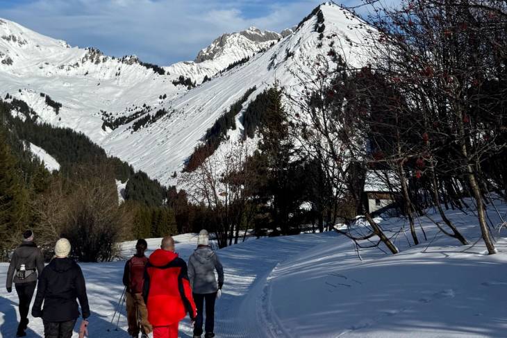 De vraag is of we de sneeuwschoenwandeling zullen voortzetten zoals gepland en door de diepe sneeuw naar het beoogde hooggelegen gebied zullen wandelen voor de lunch, of de sneeuwschoenen aan de wilgen zullen hangen om over beter begaanbare paden de tocht op gewone wandelschoenen voort zullen zetten. We kiezen voor het laatste, want ook tijdens zo’n ‘gewone’ hike zijn er al prachtige uitzichten te bewonderen. We zien het topje van de Mont Blanc opdoemen en vlak voor ons rijst de ‘helse’ berg Roc d’Enfer op met zijn vervaarlijke puntige tanden. Deze berg zou verraderlijk zijn voor iedereen die hem wil bedwingen. Ook lopen we langs schattige houten berghutjes met een dikke laag sneeuw op het dak. Uiteindelijk keren we terug naar Praz-de-Lys, waar we lunchen bij restaurant Dahu onder aan de piste.