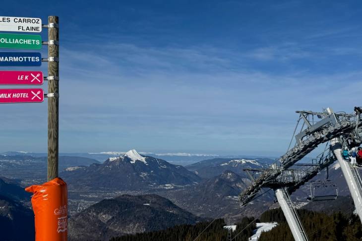 Nog een geheimtip is Les Carroz, een sfeervol dorpje vlak bij de snelweg A40 op een uur rijden van Praz-de-Lys. We gaan meteen langs bij de skiverhuur voor alle benodigdheden. Als ik de volgende dag bij ons Milk Hotel de gordijnen open, is de nabije piste gehuld in een roze ochtendgloed. Ons ski-avontuur gaat van start bij Les Carroz 1500 in het gebied Grand Massif. Emilie, die voor het Franse team uitkwam als snowboardster en ook uitmuntend kan skiën, gaat mee als gids. We nemen de stoeltjeslift Les Molliets naar Tête des Saix op circa 1850 meter. Vanaf hier kun je alle kanten op, onder meer naar het naburige dorp Flaine. Ik houd het op blauwe pistes en ook daar zitten steile stukken bij. Gelukkig haalt Emilie me over gewoon door te skiën en dat werpt z’n vruchten af. Leuk is dat we tijdens de tocht gemzen op de berg zien!