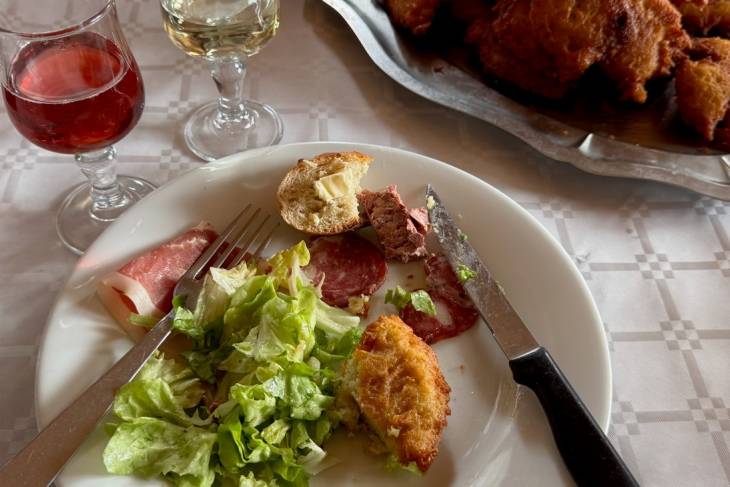 Deze overburen van Dahu hebben een goede keuken. Wij eten er tartiflette, een traditionele ovenschotel uit de Savoie in de Franse Alpen en de Aosta-vallei in Italië met aardappelen, spek en Reblochon-kaas.