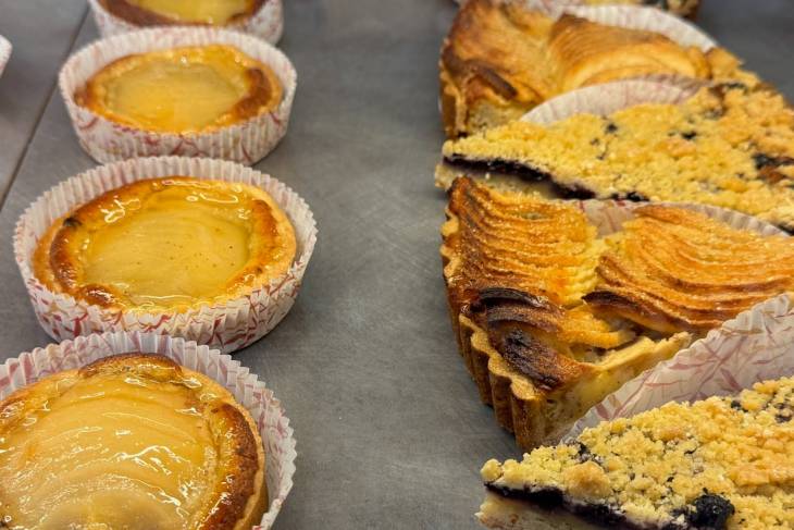 Boulangerie vol versnaperingen, waaronder amandeltaart, amandelbiscuits, appel- en perentaartjes, éclairs etc. Alles oogt aantrekkelijk. Laat dat maar aan de Franse bakker over.