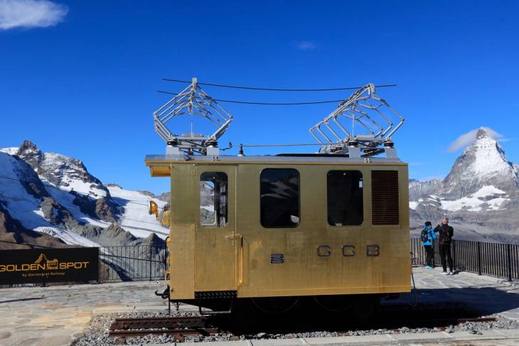TIP: bekijk de vergulde oude locomotief op de Golden Spot. Hij symboliseert de pioniersfase en technische geschiedenis van de Gornergratbahn, de eerste volledig elektrische tandradbaan van Zwitserland.